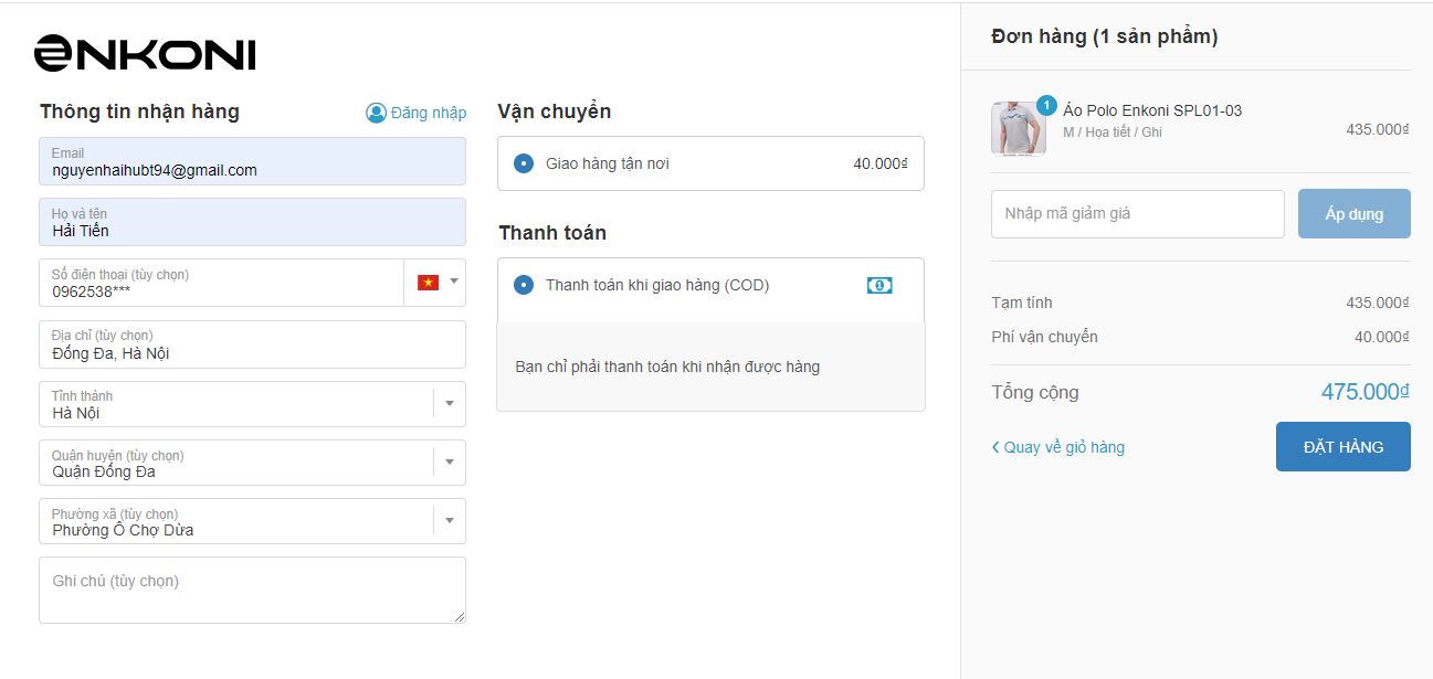 Bước 4: Điền các thông tin của bạn để nhận đơn hàng, lựa chọn hình thức thanh toán và vận chuyển cho đơn hàng của mình